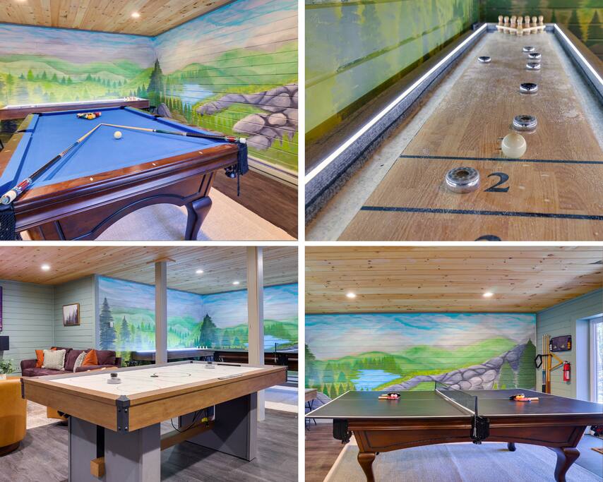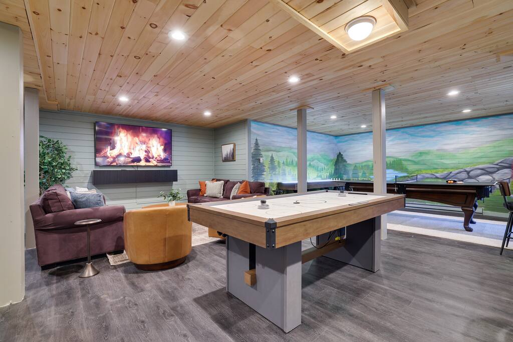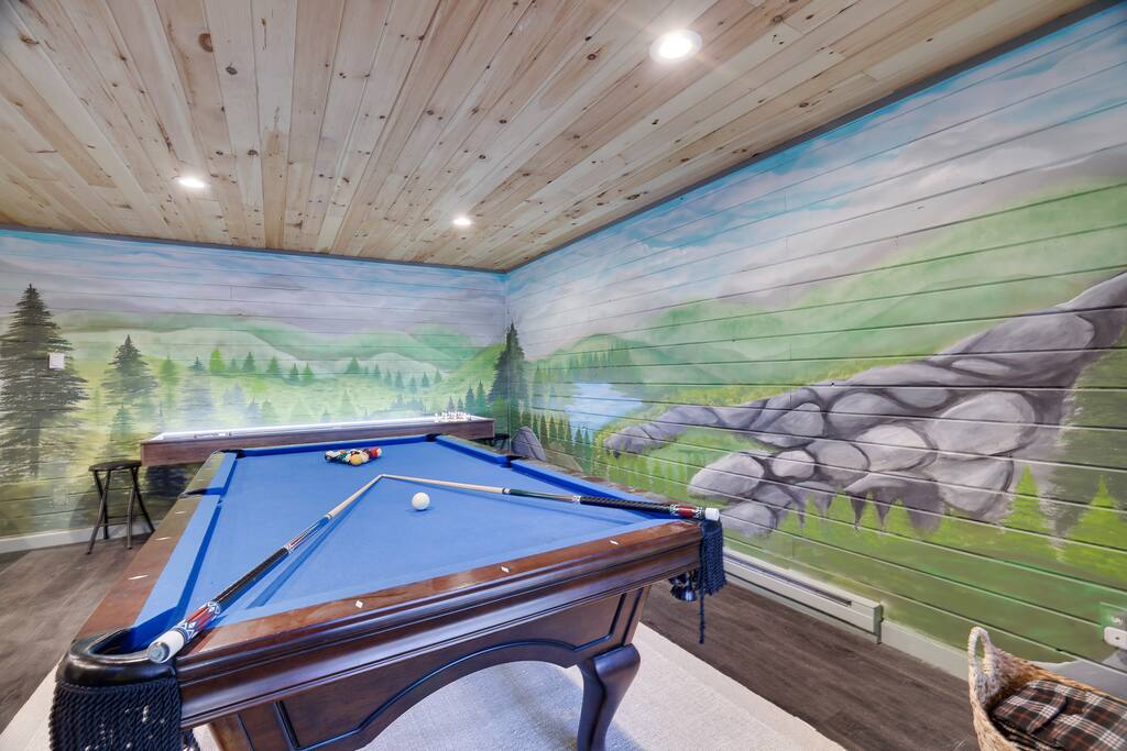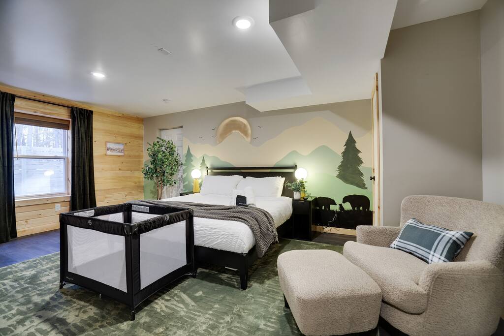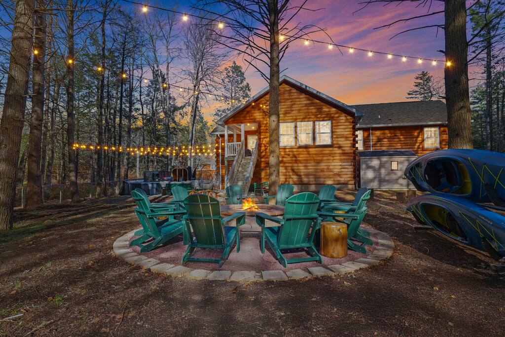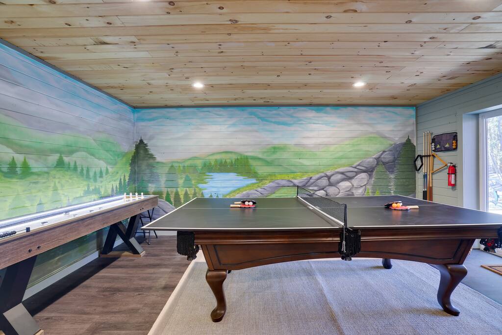 Welcome to The Painted Bear – Your Ultimate Luxurious Poconos Haven with 8 bedroom that sleeps 18 guests! **Outdoor Fun & Entertainment** 🔥 Outdoor Kitchen with BBQ Grill and 🍕Pizza Oven+ Outdoor Fridge ♨️ Hot Tub 🧖 Sauna 🪵 Firepit with seating for 10 🛶2 Private Kayaks and 2 Paddleboards (NO extra cost) on site with trolley (Memorial Day - Labor Day) 🎣 Fishing and relaxing on nearby lake with beach, 2 foldable beach chairs and beach towels 🪑 Outdoor Lounge Area w/ egg chairs and outdoor dining 🛝 Kids’ Natural Playscape with outdoor rope bridge, labyrinth maze, wooden logs to jump on with beach sand 🏖️ Hammock and corn hole **Indoor Fun & Enjoyment** 🎮 Epic Game room with home theater with 75” smart TV 🎱 Pool Table, Ping Pong, Air Hockey, Shuffle board, Wall and Board Games 🕹️ 3 Arcade game stations 🌟 Smart TV in each room with King or Queen Beds 👩🍳 Fully equipped Chef’s Kitchen 🍽 Spacious Dining Room with seating for 12, plus 5 on kitchen island and 6 at a breakfast table ☕ Coffee Bar for coffee enthusiasts: Breville Barista Express Espresso Machine, French Press, Keurig Pod Coffee Maker and classic drip coffee 🎨 IG-Worthy Murals: Hand-painted by a national acclaimed mural artist 💼 Dedicated workspace with an office desk and chair 🔥 AC in summer **Extras** 👶 Family-friendly: Pack 'N Play, booster highchair, children dinnerware, baby camera monitor, diaper changing table and diaper pail ⚡Free EV Charger on site 🚘 Ample parking for up to 12 vehicles 📶 Fast WiFi 🛏 Fresh linens, fluffy towels, and bathroom essentials all included for a comfortable stay 🏞️ Community private lake, with a beach area, kids play park, picnic tables, and BBQ stations 🛏 Sleeps 18 | 8 Bedrooms | 3 Bathrooms MAIN 1ST FLOOR with 3 bedrooms: 👑🛏 Room 1: Master Bedroom: King bed with ensuite full bath + jacuzzi 👑🛏 Room 2: King bed 👸🛏 Room 3: Queen bed GROUND FLOOR with 5 bedrooms: 👸🛏 Room 4: Queen bed 🛏🛏 Room 5: Kids Room: Twin on Twin bunk bed 🛏🛏 Room 6: Twin XL on Queen Bunk Bed 🛏🛏 Room 7: Twin on Twin Bunk and Queen on Queen Bunk bed 👑🛏 Room 8: King bed with baby pack and play **Prime Location** 📍 Quiet neighborhood with a forest vibe+walking distance from a private community lake 📍 4 miles/8 mins to Austin T. Blakeslee Natural Area 📍 7 miles/12 mins to Jack Frost Ski Resort & Big Boulder Mountain 📍 4 miles/7 mins to Pocono Raceway / Slingshot Rentals 📍 10-15 miles/20-30 mins to Camelback Mountain and Kalahari Resort Prioritizing Guest Safety, this home is equipped with smoke and carbon monoxide detectors, fire extinguishers, and outdoor security cameras. ✨ Book The Painted Bear now for a luxurious Poconos mountainous retreat! ⚠️ PLEASE NOTE 🕒 Instant Booking If you don't get have any reviews from other hosts, reach out before booking—we’d love to connect first. 📝 Booking Requirements To receive door access, this listing requires: - A signed rental agreement - The booker’s ID verification - A $1000 security deposit, collected via our property management system Hospitable 2 days before check-in and released 2 days after check-out provided no damage or excessive cleaning. **************** 🌲 LOCAL RESTAURANTS & ATTRACTIONS **Restaurants** Papa Santos’s Italian Restaurant & Pizzeria Jubilee Restaurant Woody’s Country House Murphy’s Loft Boulder View Tavern **Nearby Attractions** Lake Sinca - Private kayaks and paddle boards with trolley on site Austin T. Blakeslee Natural Area – A serene 130-acre woodland with hiking trails, waterfalls and creekside views Jack Frost Ski Resort & Big Boulder Mountain – Trails and scenic lift rides; skiing and snow-tubing in winter Pocono Raceway / Slingshot Rentals - Drive a 3-wheel Slingshot or catch a race event at the famous oval Camelback Mountain and Kalahari Resort - America’s largest indoor waterpark, Zip lines, mountain coaster rides, tubing and more Enjoy the best of both relaxation and adventure, all just a short distance from The Painted Bear! Township Registration #: 021314 Must be 25+ to rent, Max guests 18.
