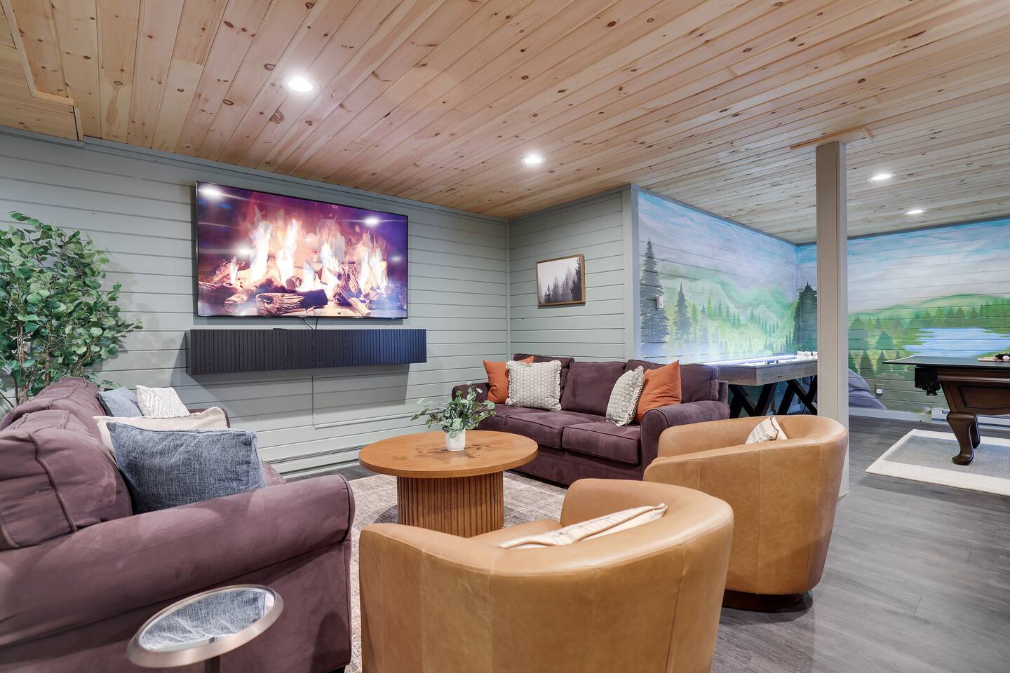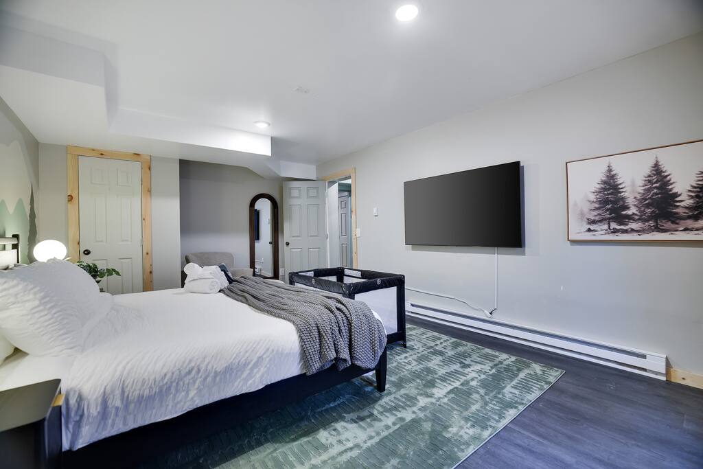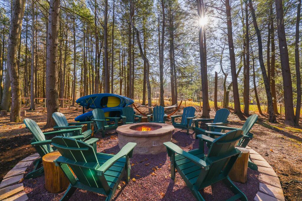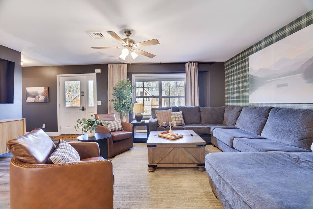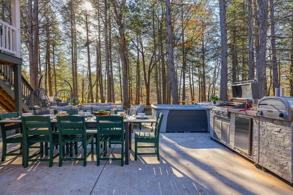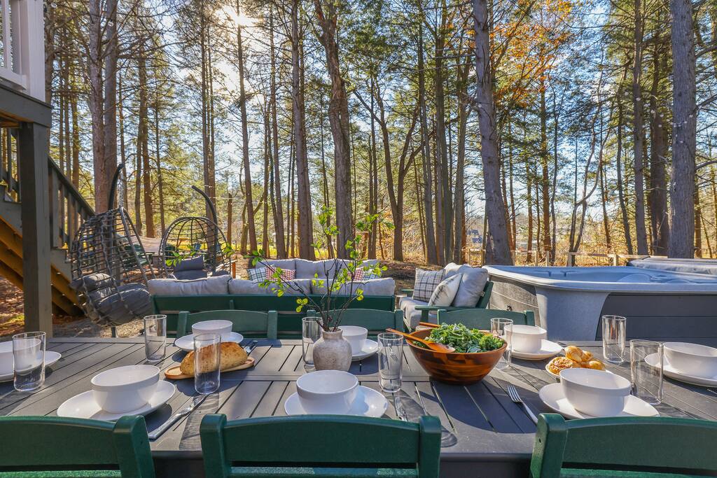 Discover this 8-BR luxury retreat designed for year-round fun and relaxation. Unwind in the sauna or hot tub after snowy days or lake adventures with our kayaks/paddleboards. Entertain in style with indoor and outdoor chef’s kitchens featuring a pizza oven. Savor gourmet coffee from Nespresso or Keurig. Compete in the game room with pool, ping pong, shuffleboard & arcade games, while kids explore the natural playscape. End the night in the cozy home theater or around the firepit under the stars.
